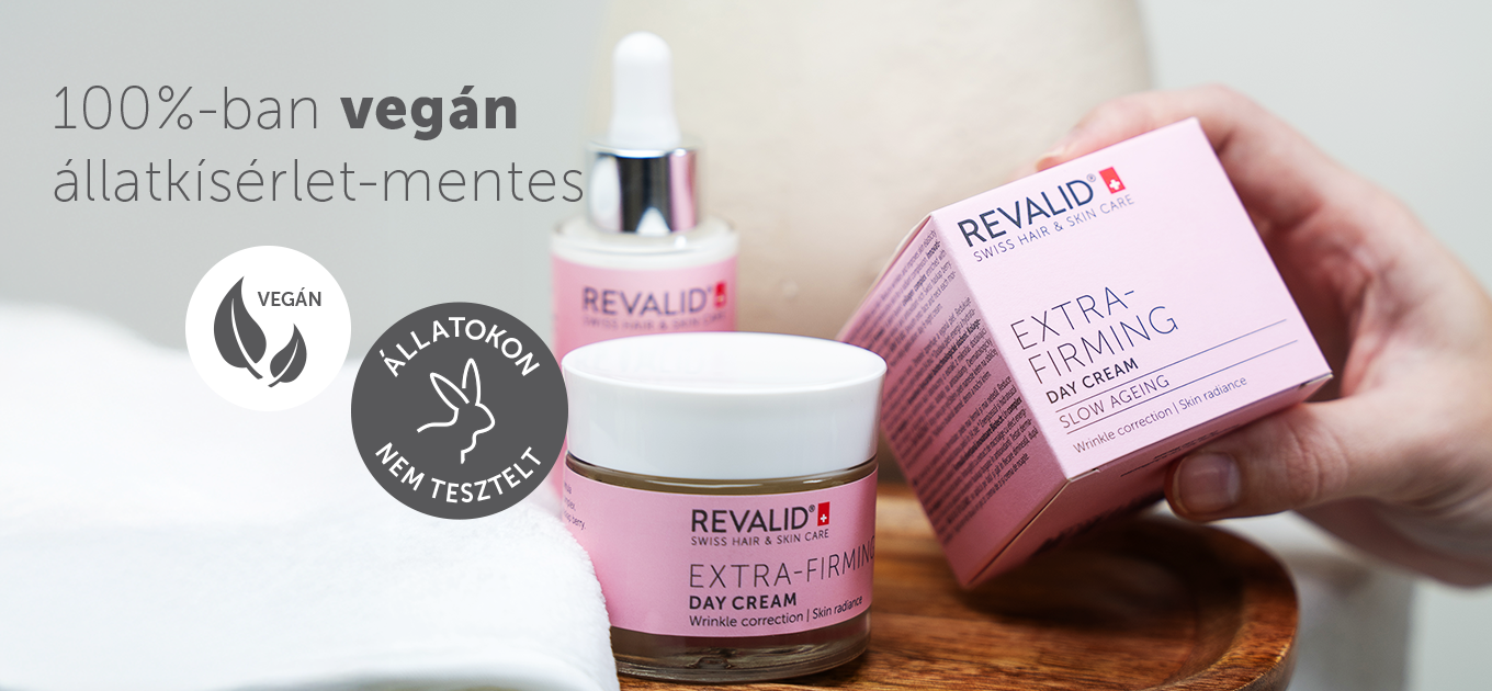 - Revalid Extra-Firming Boost Serum: Felélénkíti és erősíti a bőrt. 95%-ban természetes eredetű összetevőkből áll és 100%-ban vegán.